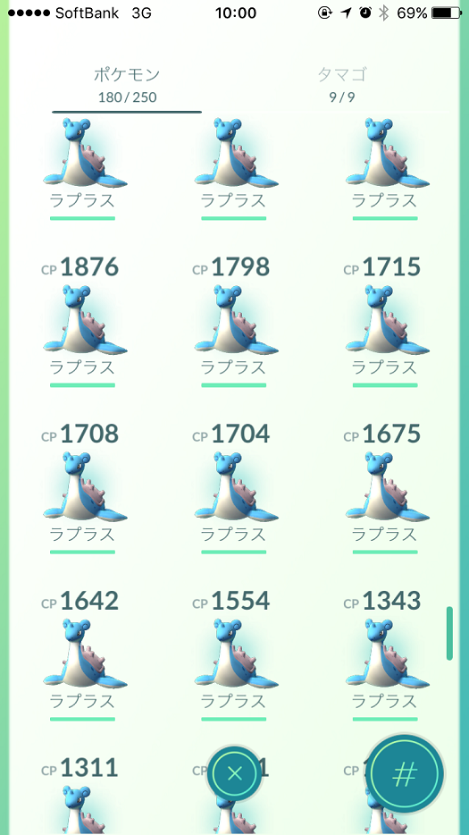 なんだかんで5時間ほど粘ってしまい(ここがこのゲームの恐い所だ)、気付けば30体近いラプラスをゲットしておりました。他にも、基本的にピッピとイーブイが大量発生、まれに野生のカビゴンやカイリューも現れるパラダイスっぷり。